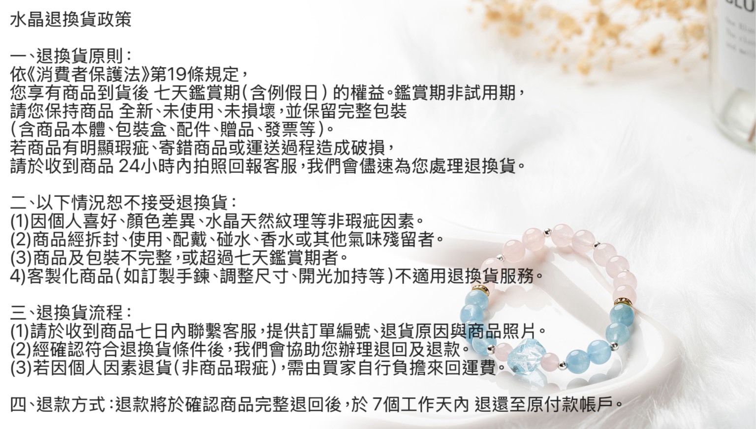 每一款水晶皆為全天然礦石,若水晶上出現黑點、礦缺、包裹物等等,皆為正常現象。